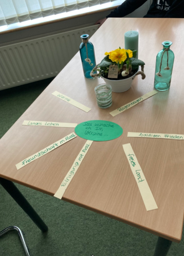 Während der ersten Woche haben sich jeden Morgen 5 Schülerinnen und Schüler eingefunden, um über ihre Gefühle zu sprechen, was sie bewegt, was sie über den Krieg gehört haben, was sie verunsichert. Wir sind manchmal sprachlos, aber immer voller Hoffnung, dass unsere guten Gedanken und Wünsche den Menschen in der Ukraine Kraft geben, aber auch uns, dass wir hoffnungsvoll in jeden neuen Tag starten.